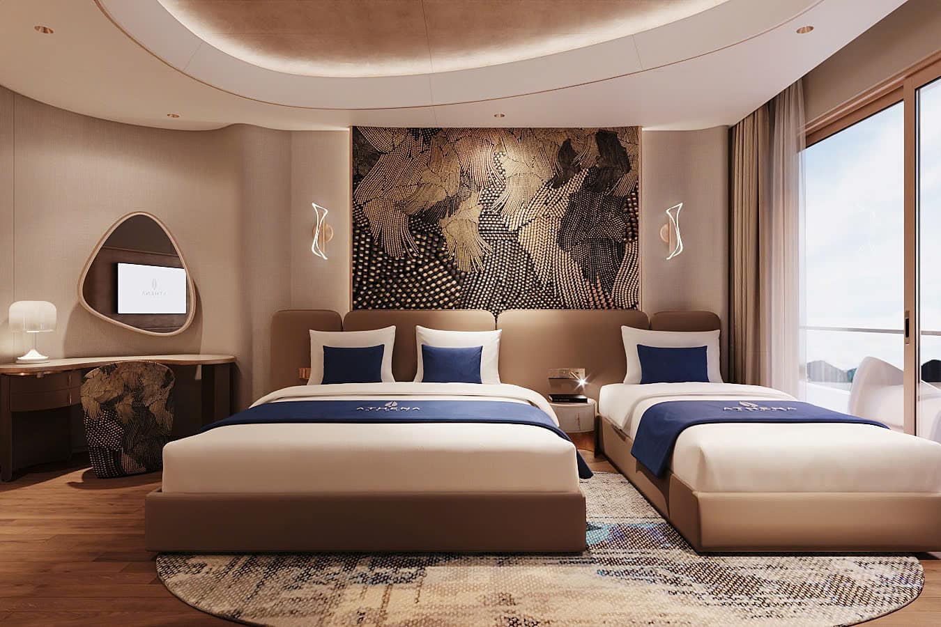 Spanning 43m², Athena Triple Balcony Cabin offers a spacious and thoughtfully arranged layout, perfect for families or groups of friends. The cabin features a bright living area with 1 double bed and 1 single bed, a luxurious stone-clad bathroom, and a private balcony overlooking Ha Long Bay view, ideal for witnessing breathtaking sunrises or romantic sunsets.