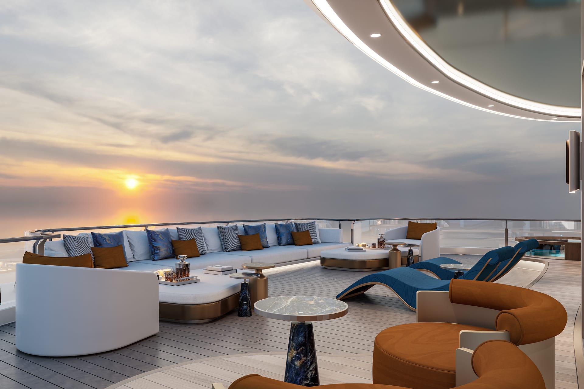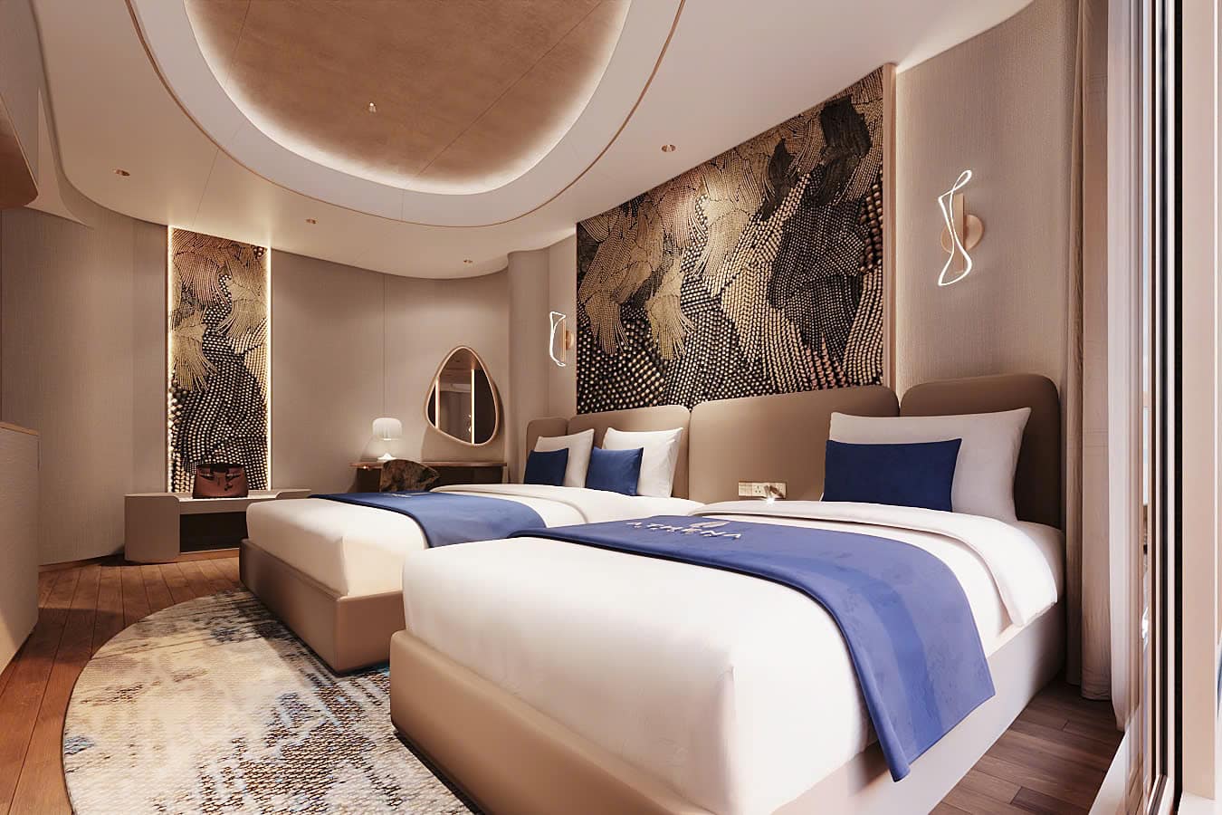 Located on the 5th floor with a sprawling 400m², Imperial Athena Suite offers an exclusive retreat aboard Athena Premium. Panoramic bedrooms welcome natural light, while the luxurious living area includes a private Presidential Lounge, dressing room, and premium vanity. Italian-imported furnishings, health-conscious wooden flooring, a private onsen, and a smart lighting system that adapts throughout the day ensure optimal comfort and a personalized experience.