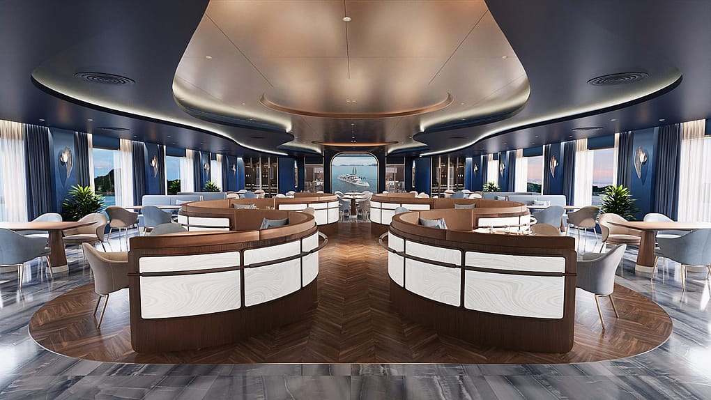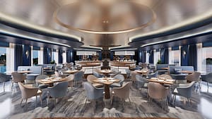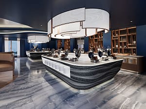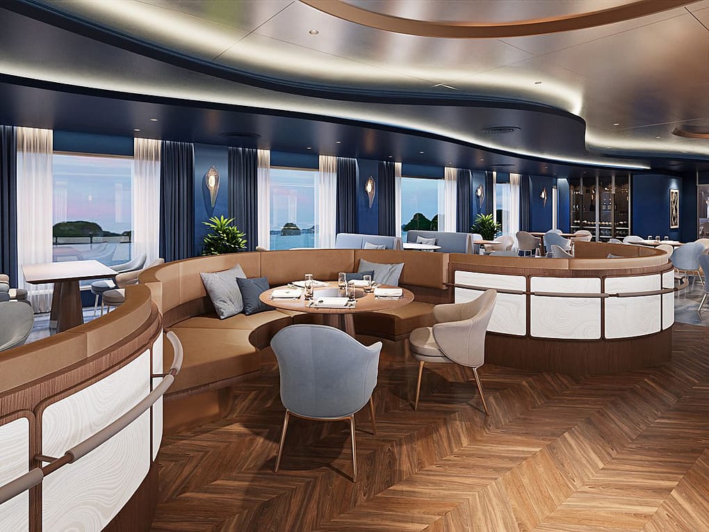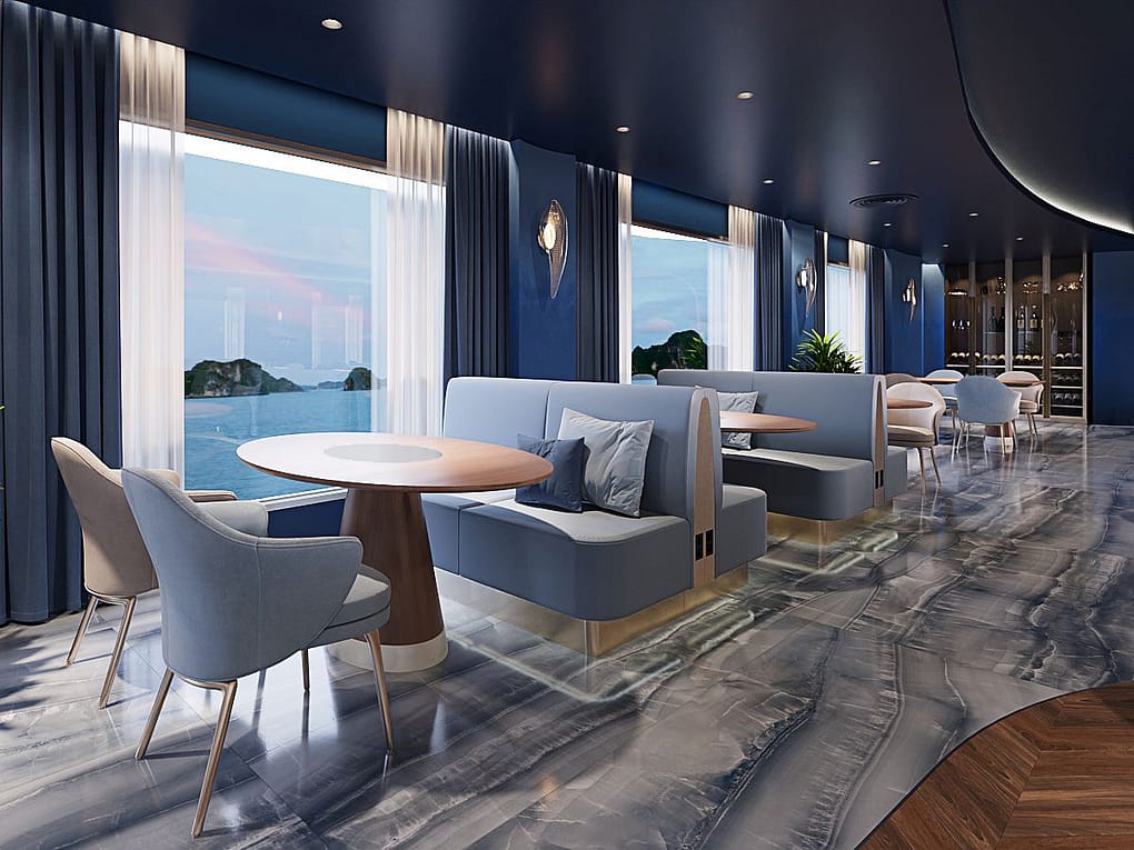 Spanning 400m2 and accommodating up to 300 guests, Ambrosia Gallery restaurant on Athena Premium is a grand dining hall at the heart of Ha Long Bay. Its elegant architecture and floor-to-ceiling glass walls offer panoramic views, where the golden hues of sunset illuminate a luxurious and inviting atmosphere.