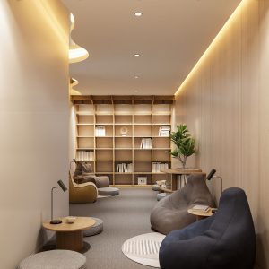 Nằm tại tầng 2 với diện tích 20m², thư viện mở cửa từ, là không gian yên tĩnh dành cho những ai tìm kiếm phút giây thư giãn và bồi đắp cảm hứng. Nơi đây lưu giữ tuyển tập sách, tạp chí nghệ thuật và hải trình du ký được chọn lọc, mở ra khoảng trời riêng để du khách thả hồn vào trang sách, phiêu du cùng con chữ, hay thưởng thức ly trà và tận hưởng khoảnh khắc an yên.