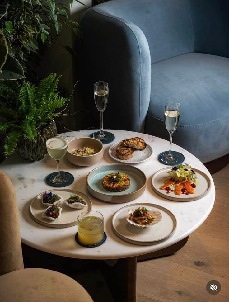 Guests enjoy dinner (table service).