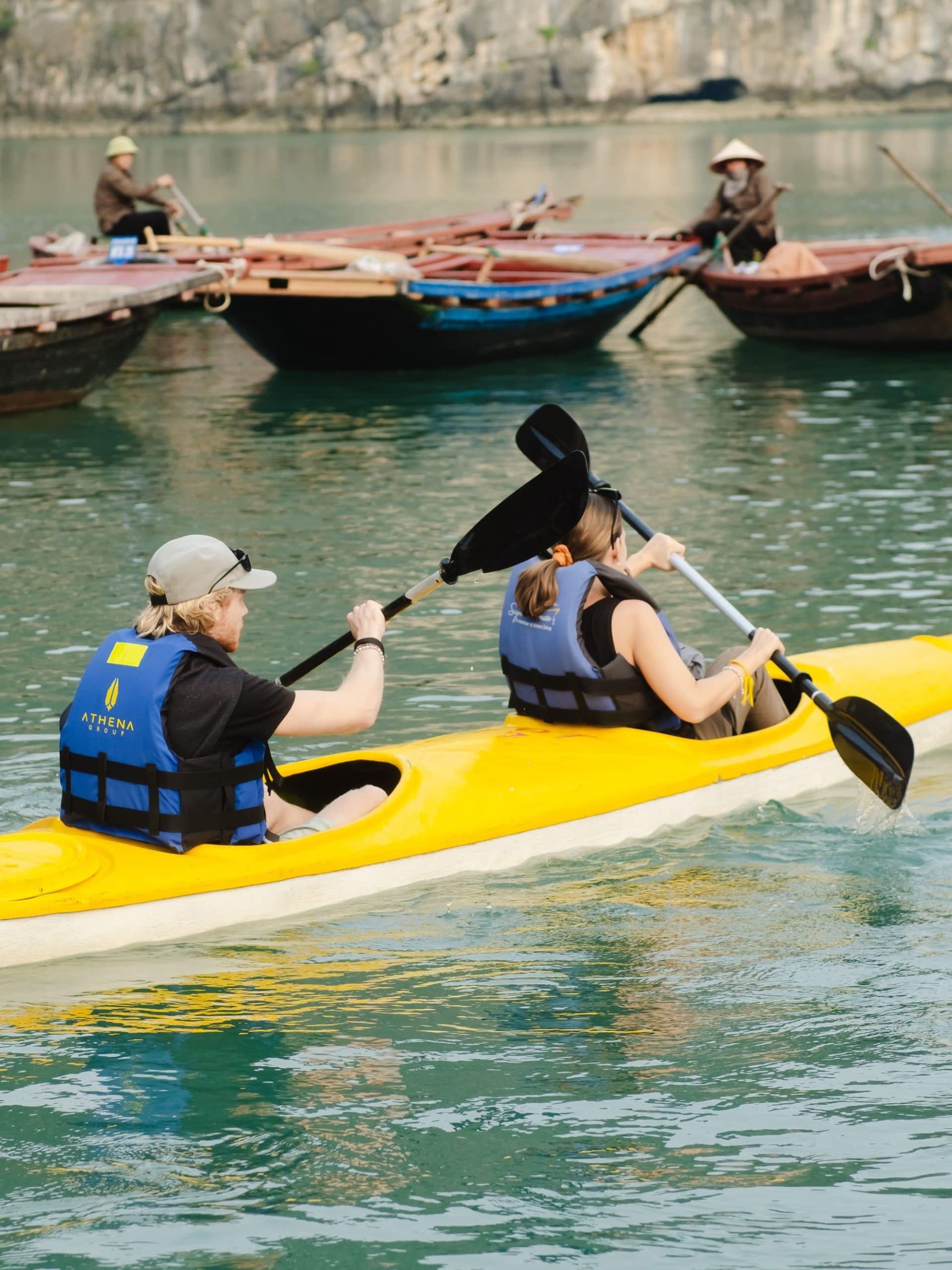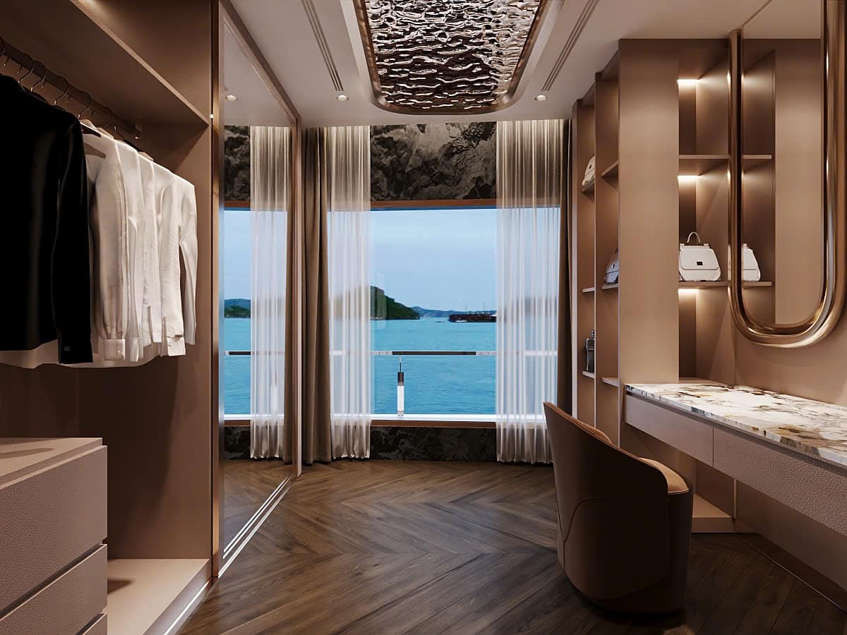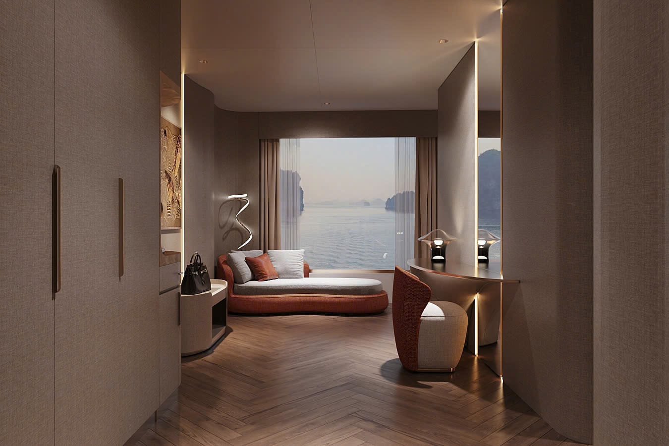 총 면적 70m²의 1층 데크에 위치한 아테나 커넥팅 발코니 캐빈은 유연한 상호 연결 공간으로 세심하게 설계되어 가족 또는 친구 그룹에게 이상적입니다. 넓은 레이아웃과 전용 복도, 잘 정돈된 편의시설은 개인 프라이버시와 공유의 순간을 모두 제공하여 게스트들이 함께 시간을 즐기면서도 자신만의 공간에서 휴식을 취할 수 있습니다. 바다가 내려다보이는 인피니티 엣지 발코니에서는 일출과 일몰의 완벽한 전망을 감상할 수 있어 모든 순간을 사람과 자연, 하롱베이의 유산을 연결하는 의미 있는 경험으로 만들어 줍니다.
