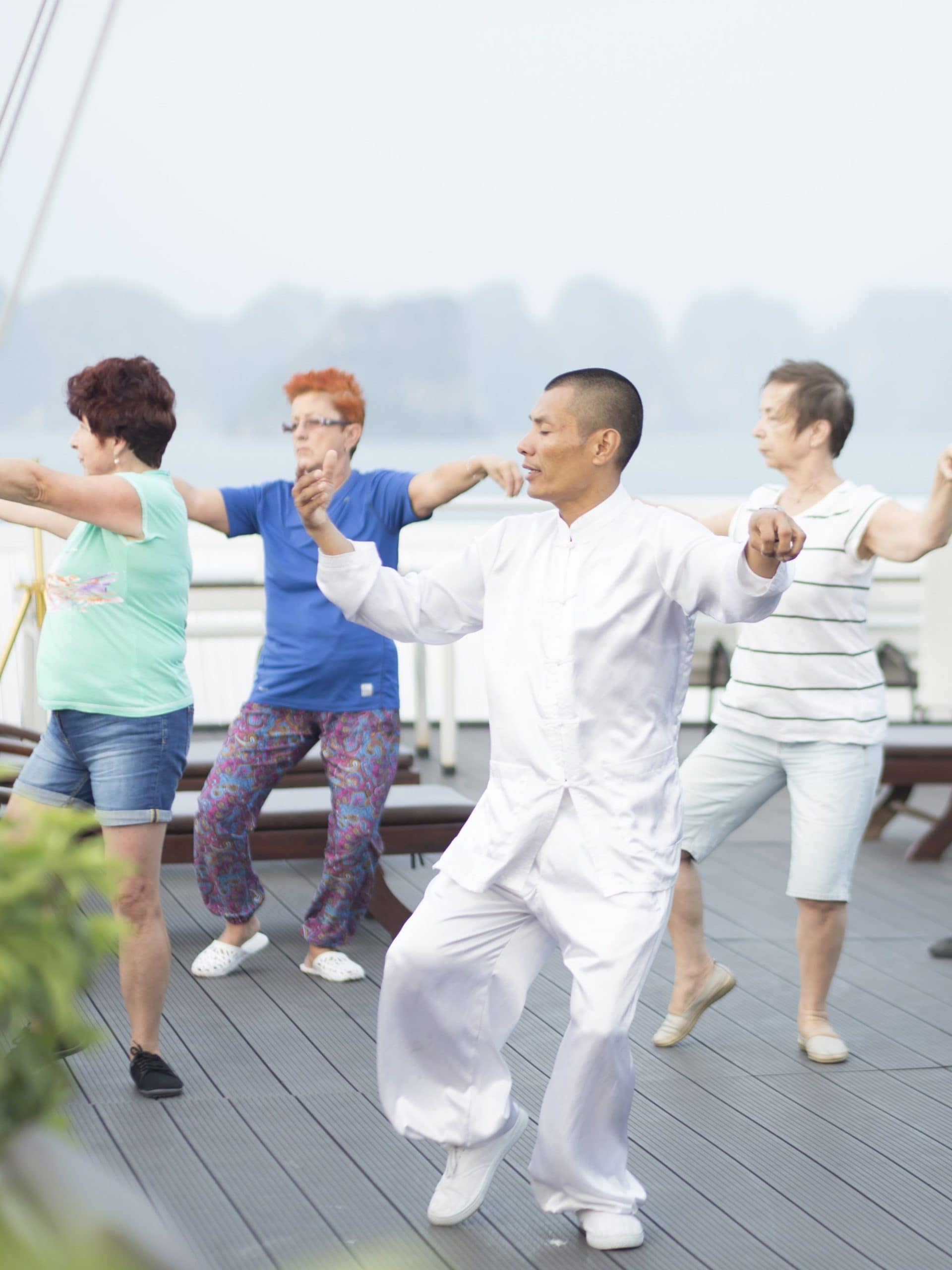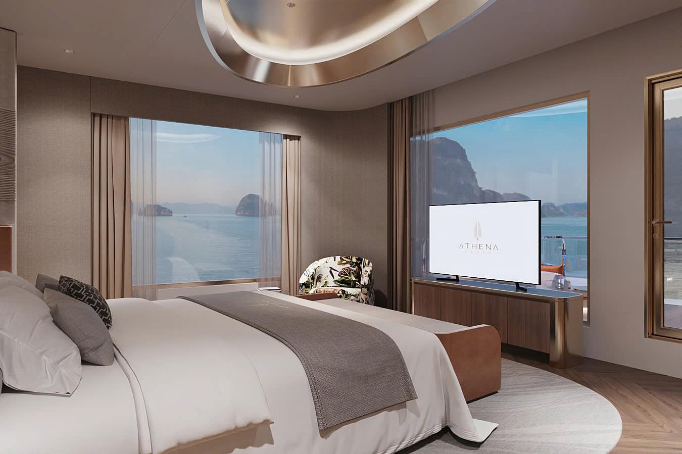 아테나 캡틴스 뷰 스위트는 브리지 옆 4번 갑판에 자리 잡고 있어 장엄한 하롱베이의 탁 트인 전망을 감상할 수 있습니다. 인피니티 엣지 발코니에서 아침 햇살을 맞이하며 영감을 주는 바다에서의 하루를 시작하세요.