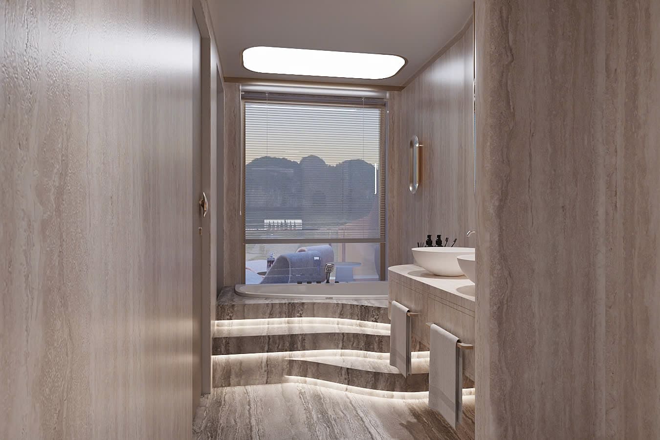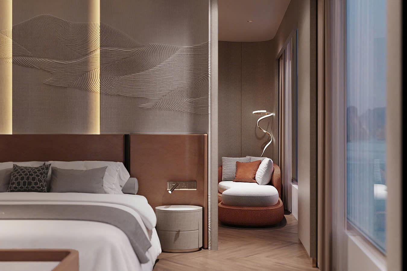 1층 갑판에 위치한 30m²의 오션뷰 룸은 차분하고 편안한 휴식처로 설계되었습니다. 따뜻한 브론즈 톤과 부드러운 조명, 깔끔하고 모던한 라인이 절제된 우아함을 자아내는 인테리어가 특징입니다. 세심하게 배치된 가구와 잘 계획된 레이아웃은 머무는 내내 프라이버시와 휴식을 보장합니다.