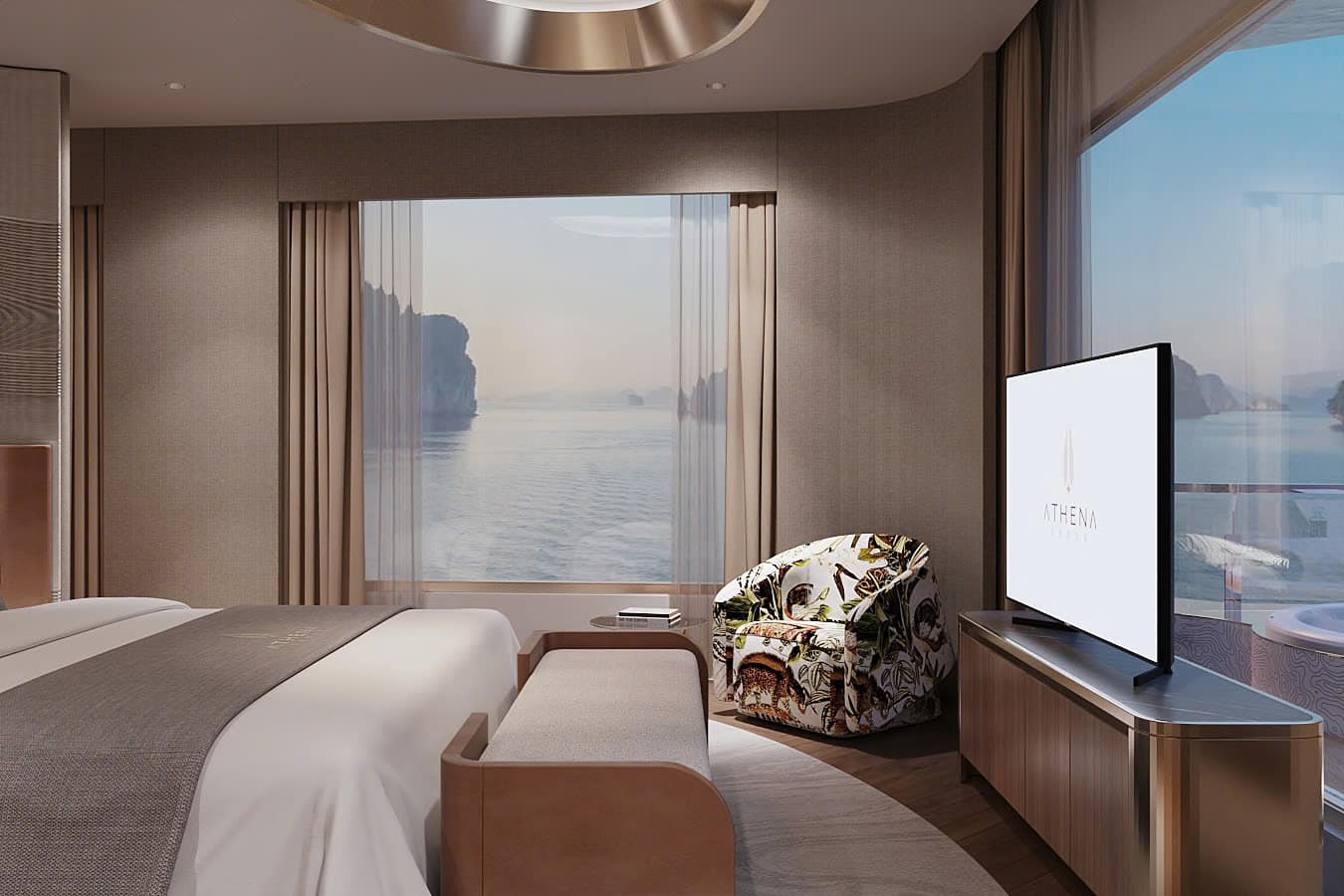 5층에 400m²의 넓은 공간에 위치한 임페리얼 아테나 스위트는 아테나 프리미엄 선상에서 특별한 휴식을 제공합니다. 탁 트인 침실은 자연 채광이 들어오고, 고급스러운 거실 공간에는 전용 프레지덴셜 라운지, 드레스룸, 고급 화장대가 마련되어 있습니다. 이탈리아에서 수입한 가구, 건강을 고려한 목재 바닥재, 전용 온천, 하루 종일 조절되는 스마트 조명 시스템이 최적의 편안함과 개인 맞춤형 경험을 보장합니다.