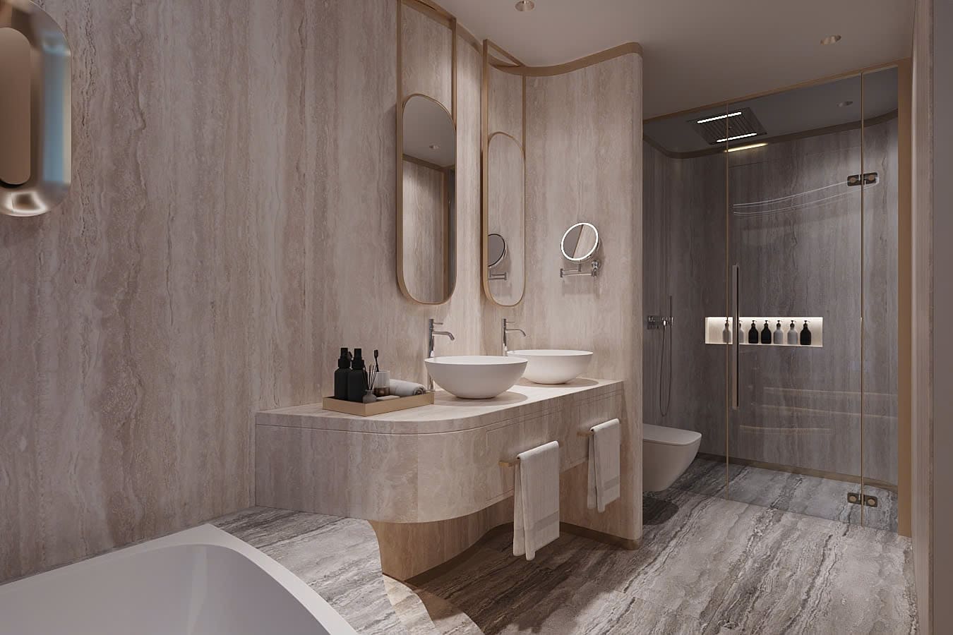 2층 전체를 차지하는 45m² 규모의 아테나 프리미엄 발코니 캐빈은 하롱만의 가장 아름다운 전망을 선사하며, 고급스러움과 세련된 프라이버시를 조화롭게 결합합니다. 끝없이 펼쳐진 바다 풍경을 감상할 수 있는 인피니티 발코니와 천연석으로 마감된 욕실에는 고급 스탠드형 욕조와 별도의 샤워기가 설치되어 있어, 표준 캐빈 부문에서 탁월한 편안함을 제공합니다.