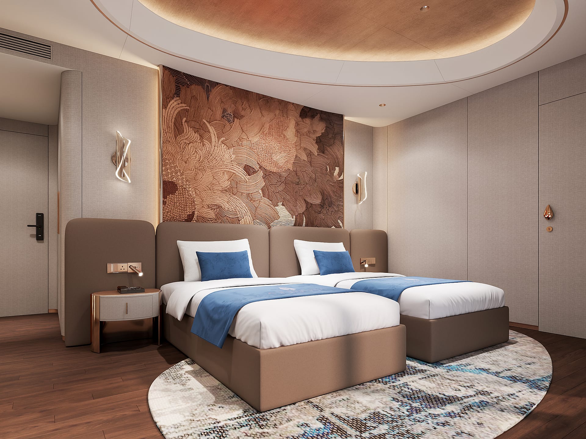 1층 갑판에 위치한 30m²의 오션뷰 룸은 차분하고 편안한 휴식처로 설계되었습니다. 따뜻한 브론즈 톤과 부드러운 조명, 깔끔하고 모던한 라인이 절제된 우아함을 자아내는 인테리어가 특징입니다. 세심하게 배치된 가구와 잘 계획된 레이아웃은 머무는 내내 프라이버시와 휴식을 보장합니다.