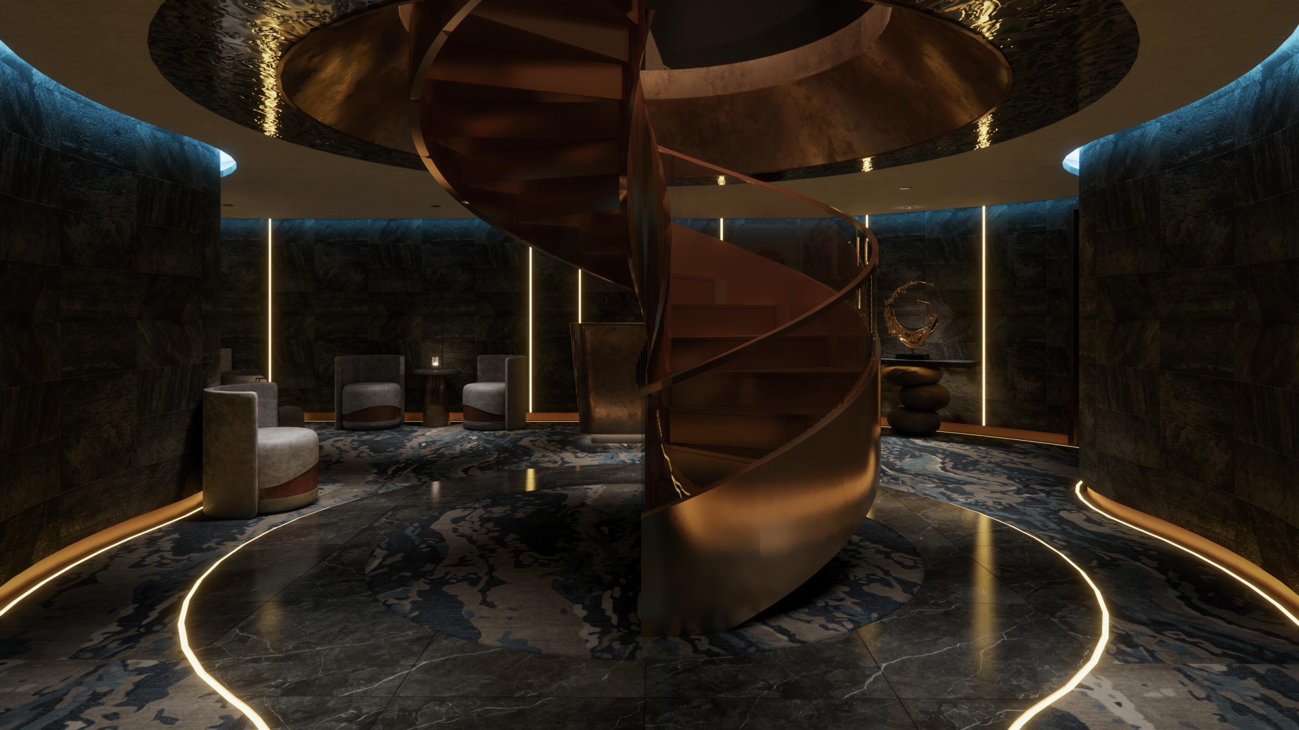 Khu phức hợp suối nước nóng và phòng xông hơi trên du thuyền Athena Premium được thiết kế như một thiên đường chăm sóc sức khỏe riêng tư, được bố trí cẩn thận trên tầng hầm để tăng cường sự riêng tư, yên tĩnh và không gian thư giãn tinh thần. Thiết kế tập trung vào cách ánh sáng, vật liệu và kiến trúc hòa quyện với nhau để dẫn dắt khách hàng vào trạng thái thư giãn sâu sắc.